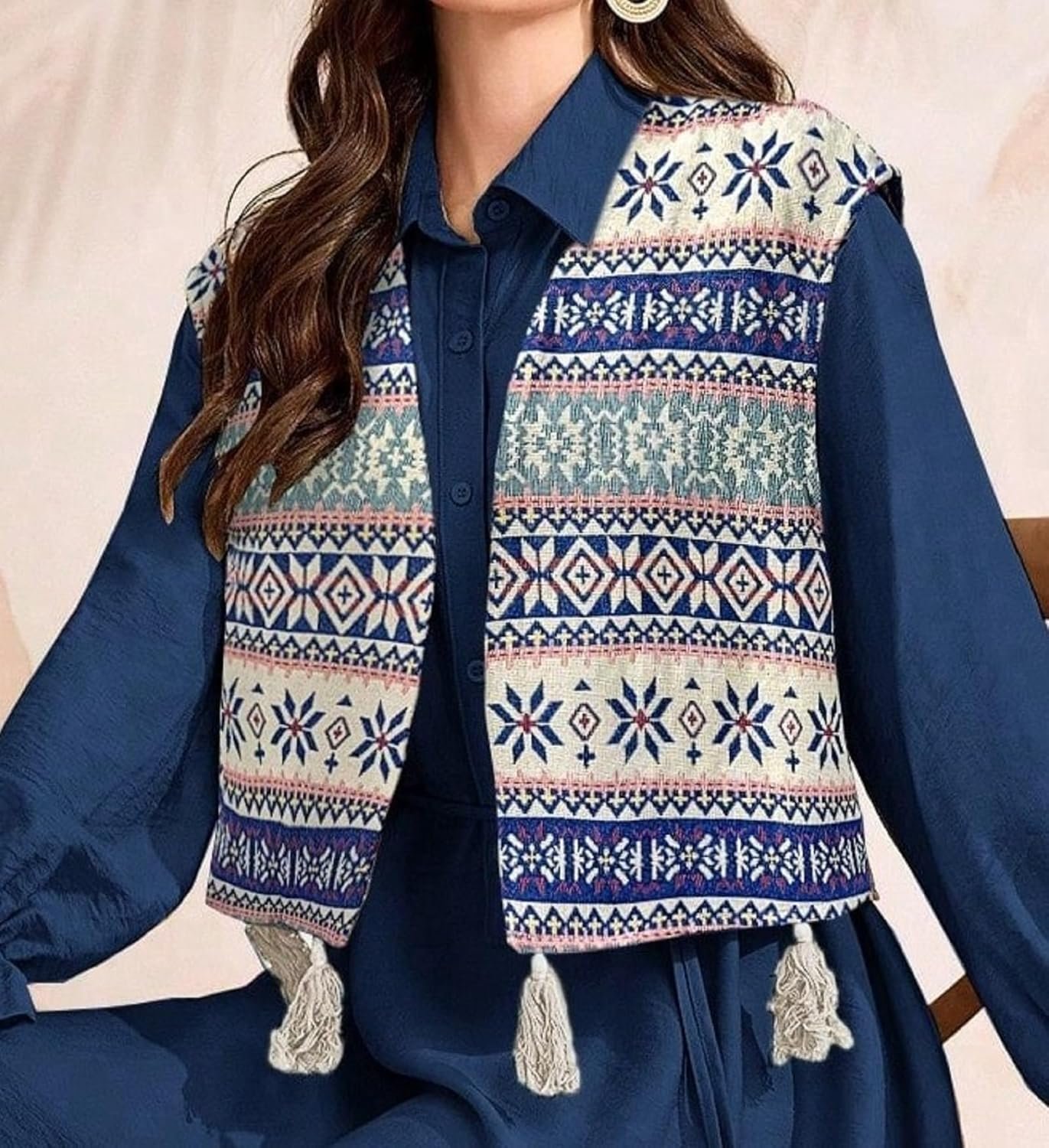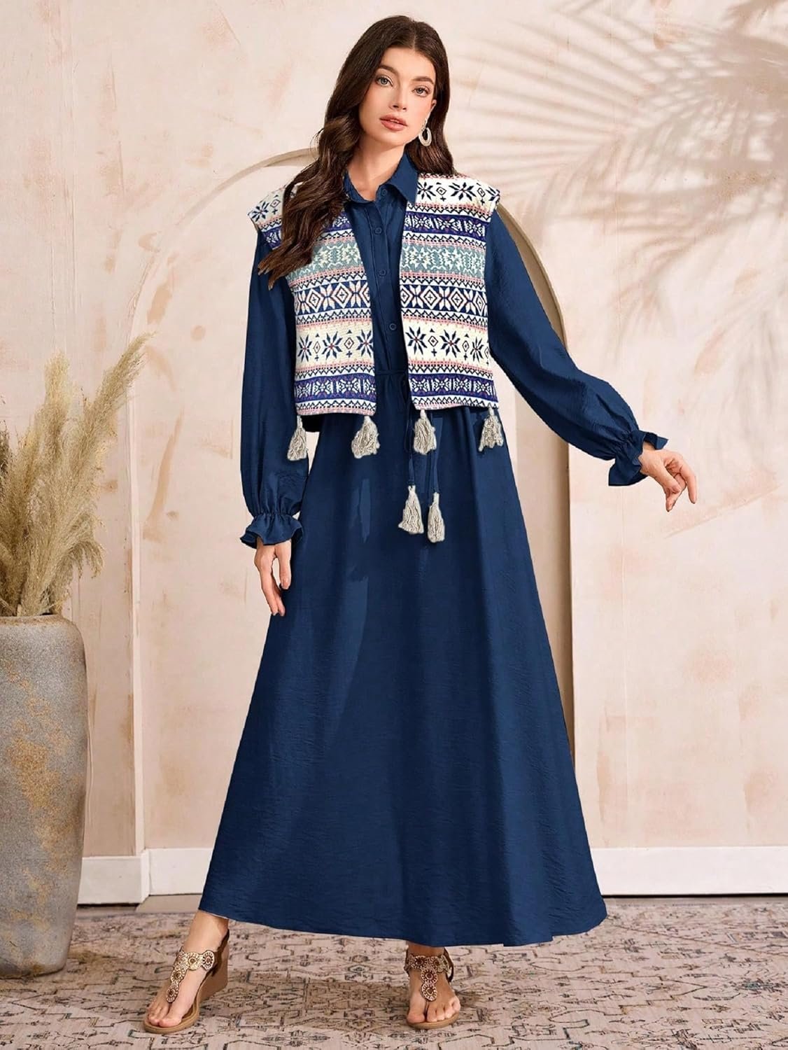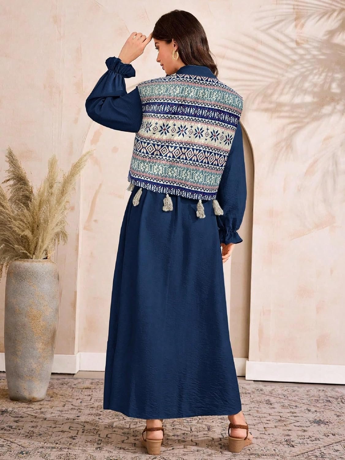 This dress looks very elegant with its deep navy blue color and long flowing design. Printed vest with tassels adds a stylish touch. Comfortable, classy, and perfect for casual or festive occasions.