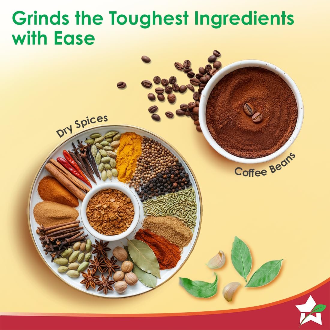 HIGH-SPEED 22,000 RPM MOTOR: Grind even the toughest ingredients effortlessly with a powerful 500W motor – delivering double the speed of ordinary mixer grinders.