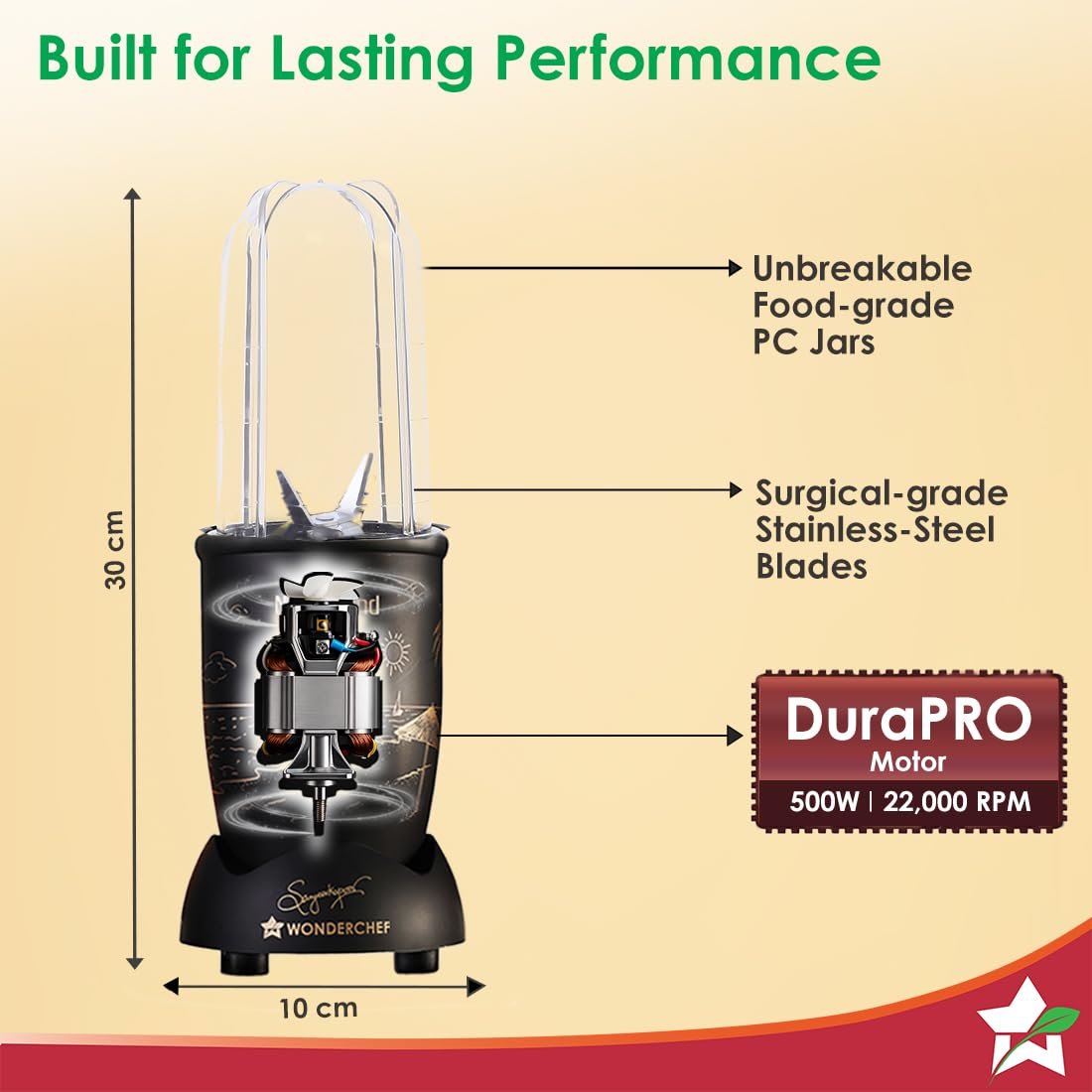 Wonderchef Nutri-blend Mist 500W Mixer Grinder, 22000 RPM, Smoothie Maker-Masala Grinder-Chutney Blender, 3 Unbreakable Jars, Limited Edition, Recipe Book by Chef Sanjeev Kapoor, 2 Yr Warranty, Black