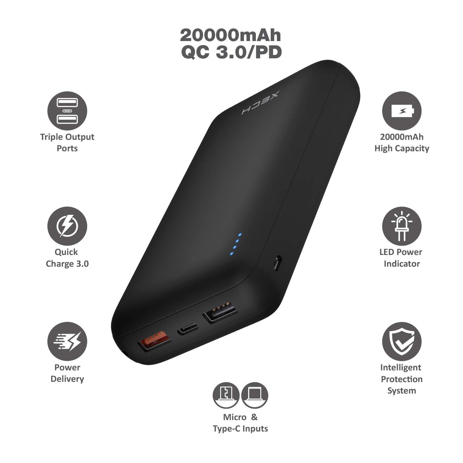 XECH Comet X Li-Polymer Fast Charging Power Delivery (PD) 18W Quick Charge(QC) 3.0 Power Bank 20000 mAH with 2 USB and 1 Type- C Ports (Black)