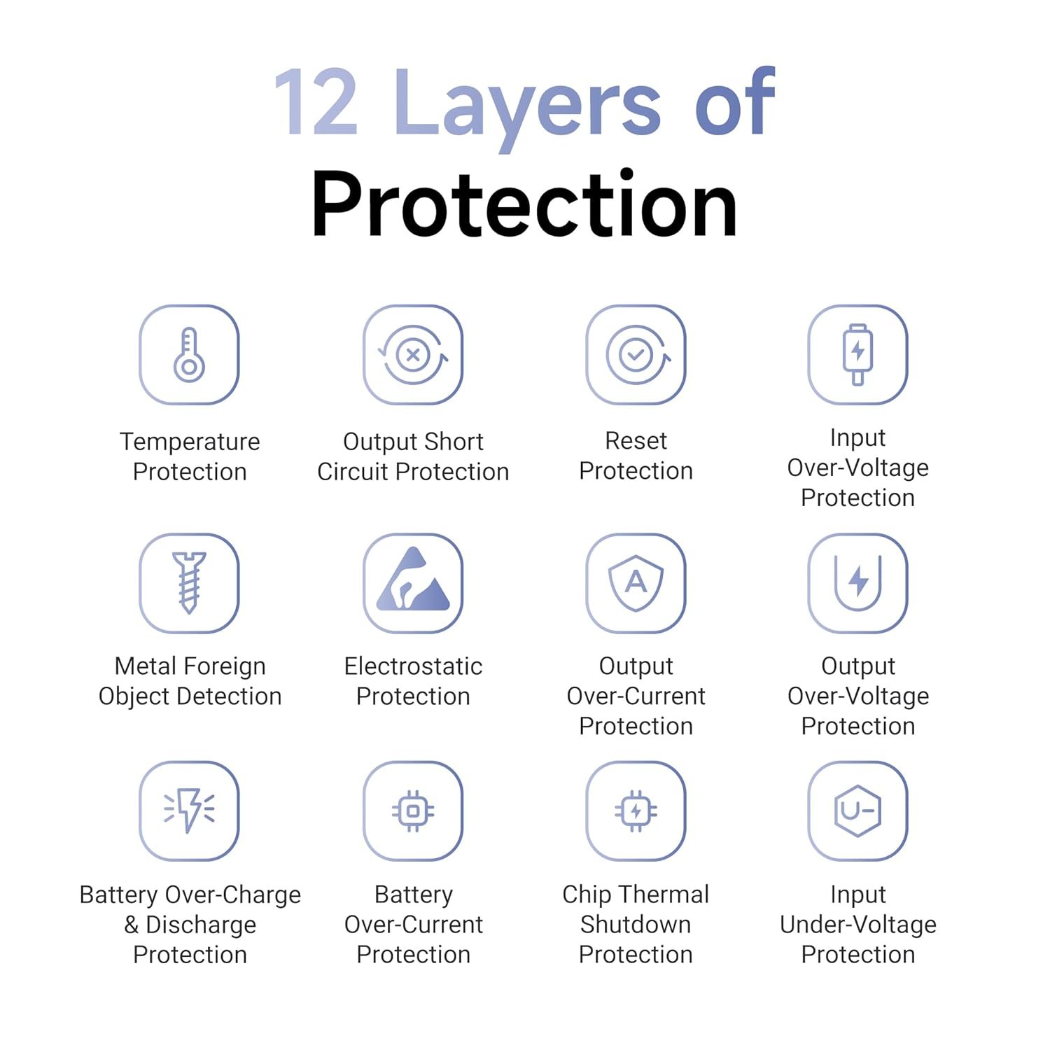 12 Layers of Safety Protection: Your safety is paramount with 12 layers of protection, including safeguards against overcharging, overheating, and short circuits, ensuring reliable performance and peace of mind.