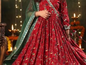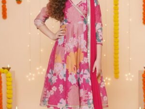 Naixa Girl’s Rayon Blend Floral Pattern Anarkali Dress Payjama Dupatta Set with 3/4 Sleeve V- Neck and Drawstring Closure Type| Kurta Sharara Set for Girl’s